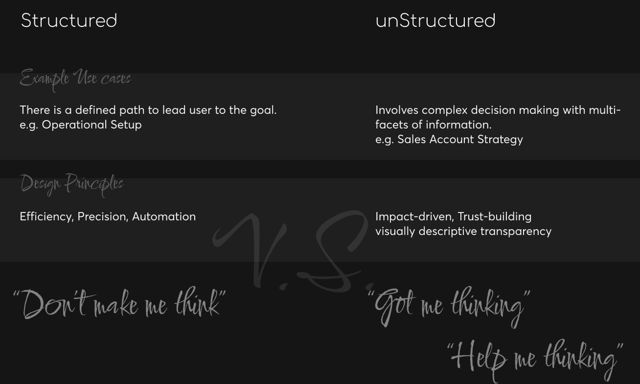 The rest, I’d like to call them unstructured use cases, e.g. landing page, object page, forecast, analytical page, etc. A good example is the “Prescriptive Billing” account page, which provided layers of information for initiating/making informed actions. In this case, there is a prescribed action, however we still put the control and transparency to the user’s hand.